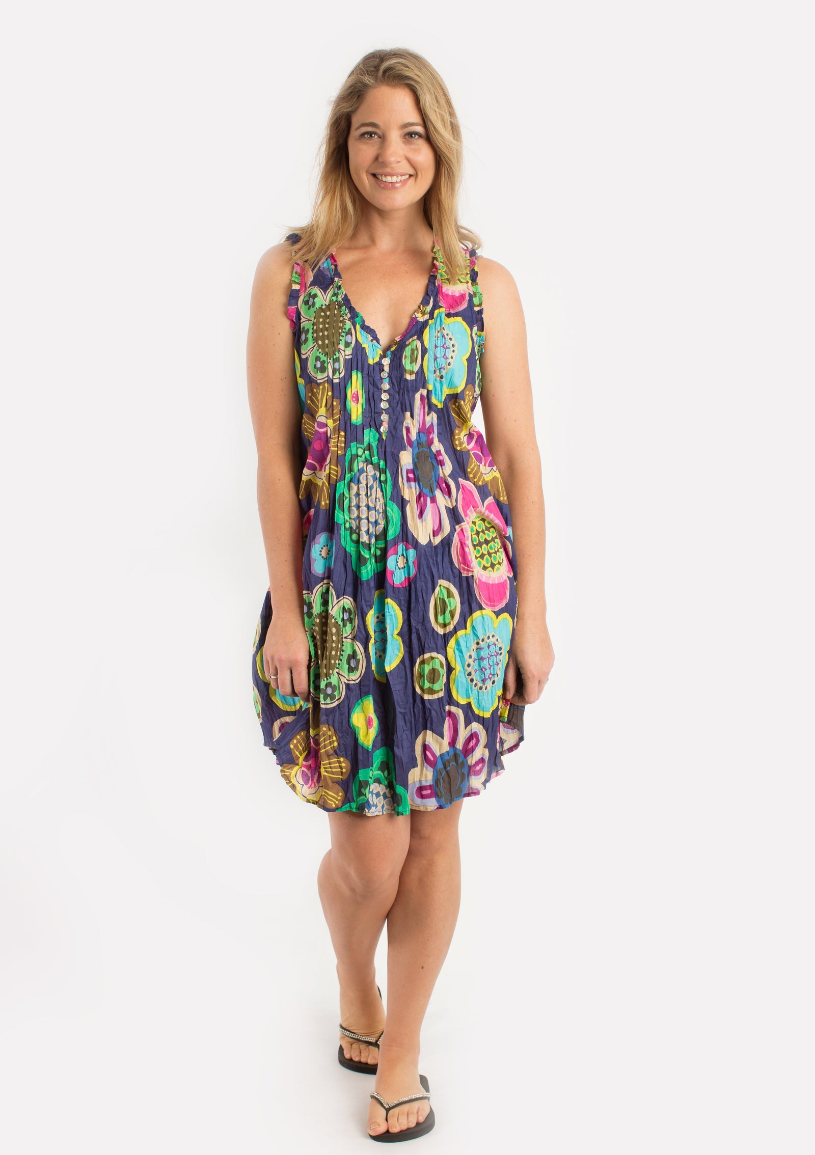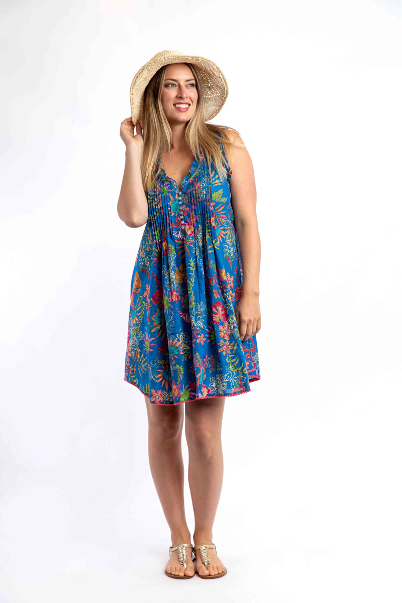 Pure cotton throw over or short dress for high summer in a convenient carry pouch for beach bag or tote.