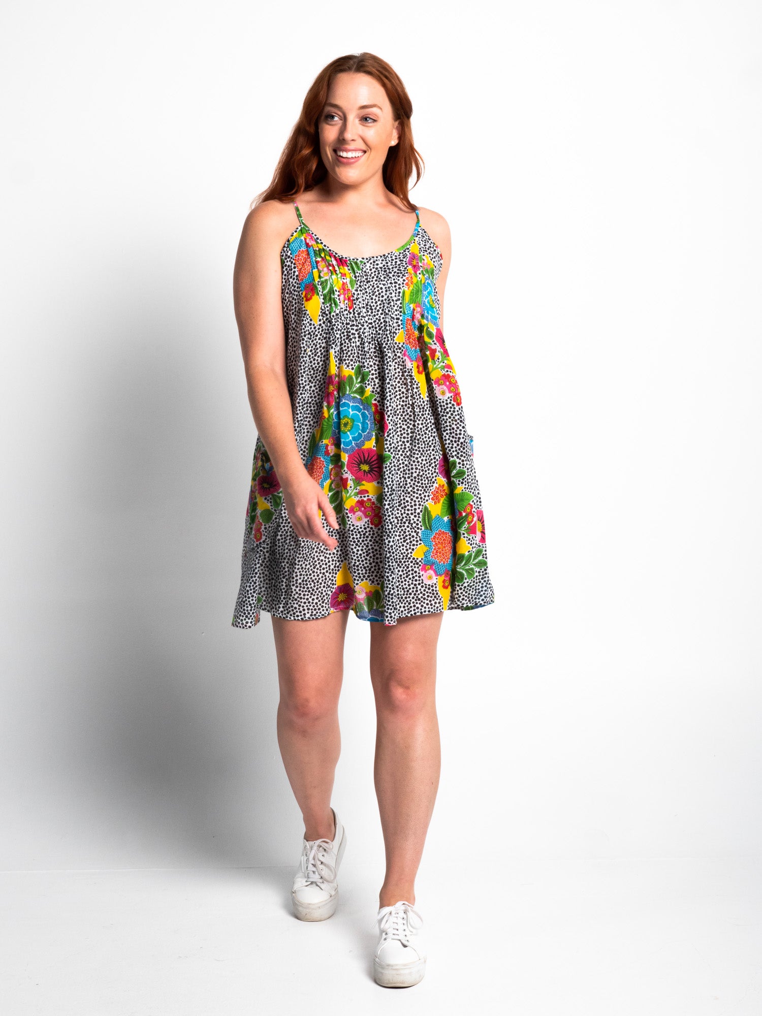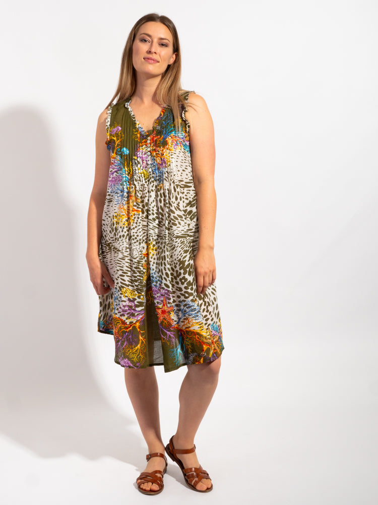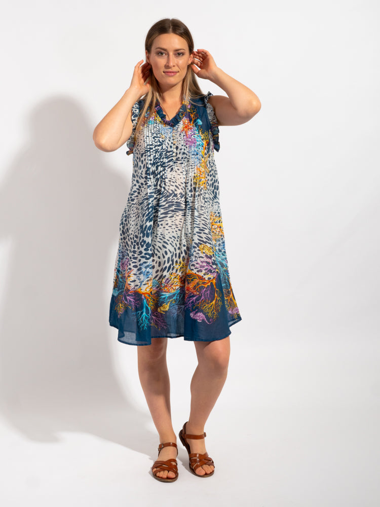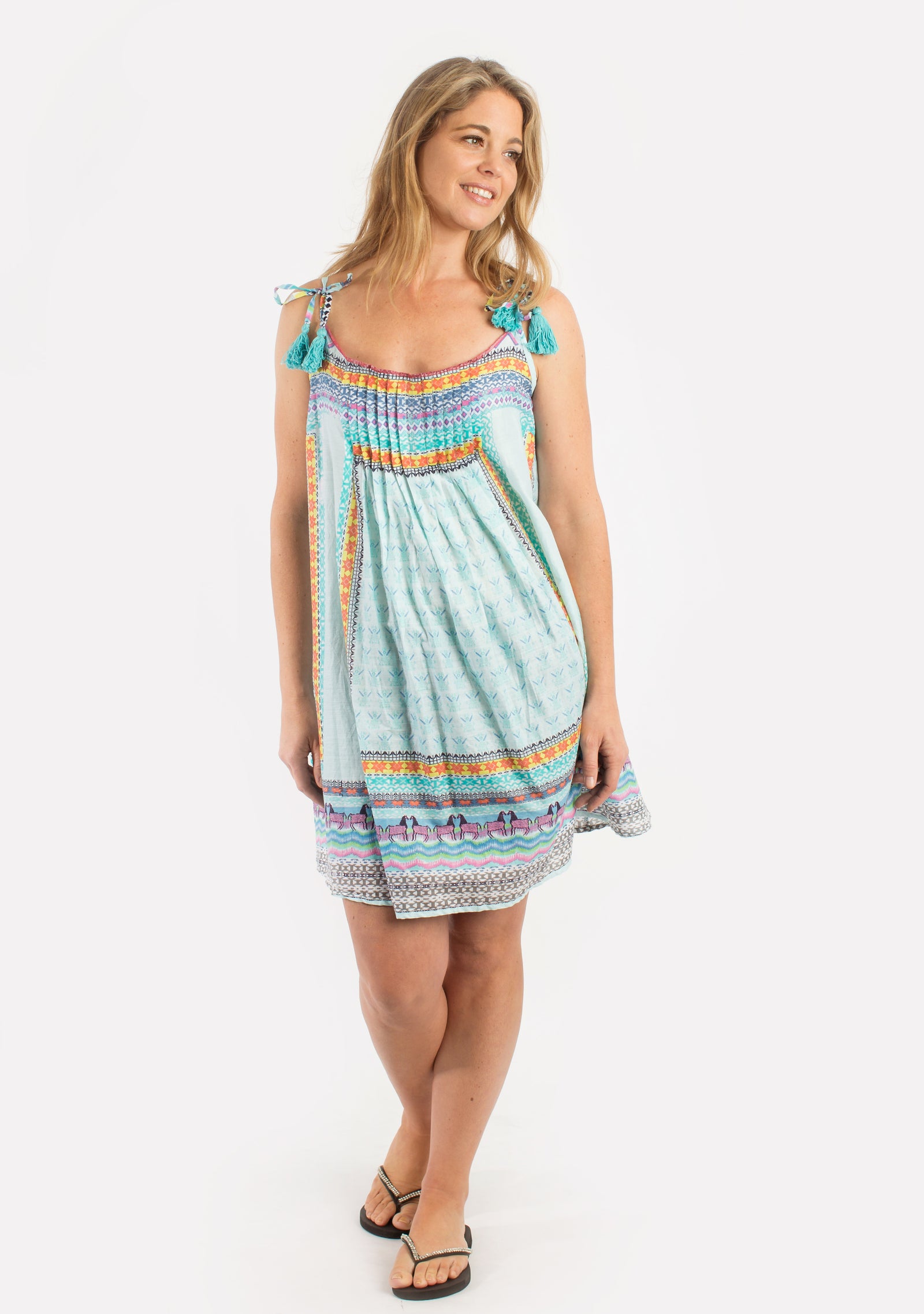 Pure cotton throw over or short dress for high summer in a convenient carry pouch for beach bag or tote.