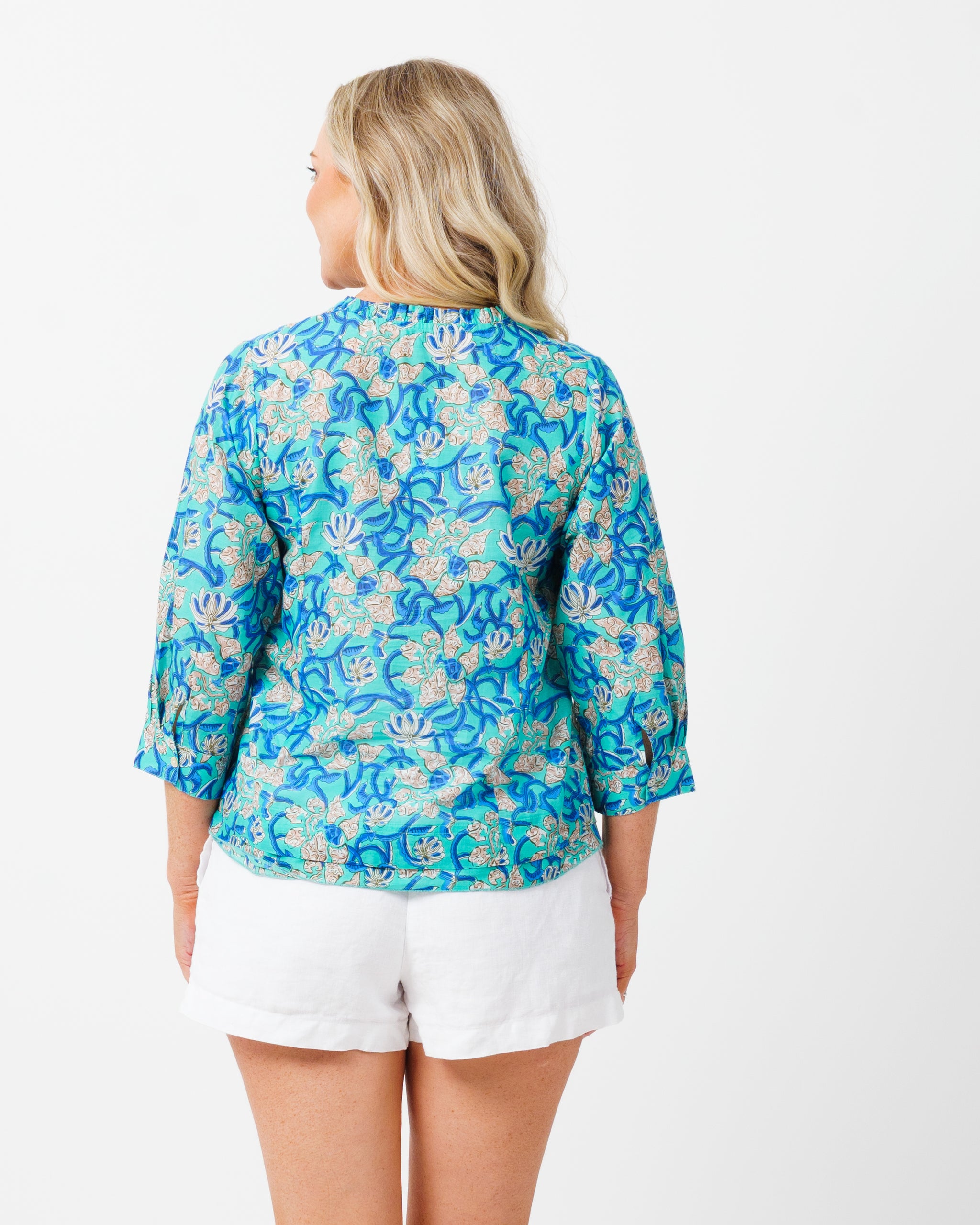 Inspired by the serene beauty of the Capricorn Coast, this style features a shorter length button-through shirt with subtle frill neck detailing. The double layered hem and 3/4 sleeves add sophistication, while the pure soft cotton ensures you stay comfortable in the heat.