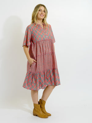 This mid-length panel dress, thoughtfully lined, boasts a shallow V-neck adorned with tasteful buttons at the placket. Its half sleeves and pure soft cotton composition make it equally perfect for sun-soaked beach days and balmy nights out, merging versatility with