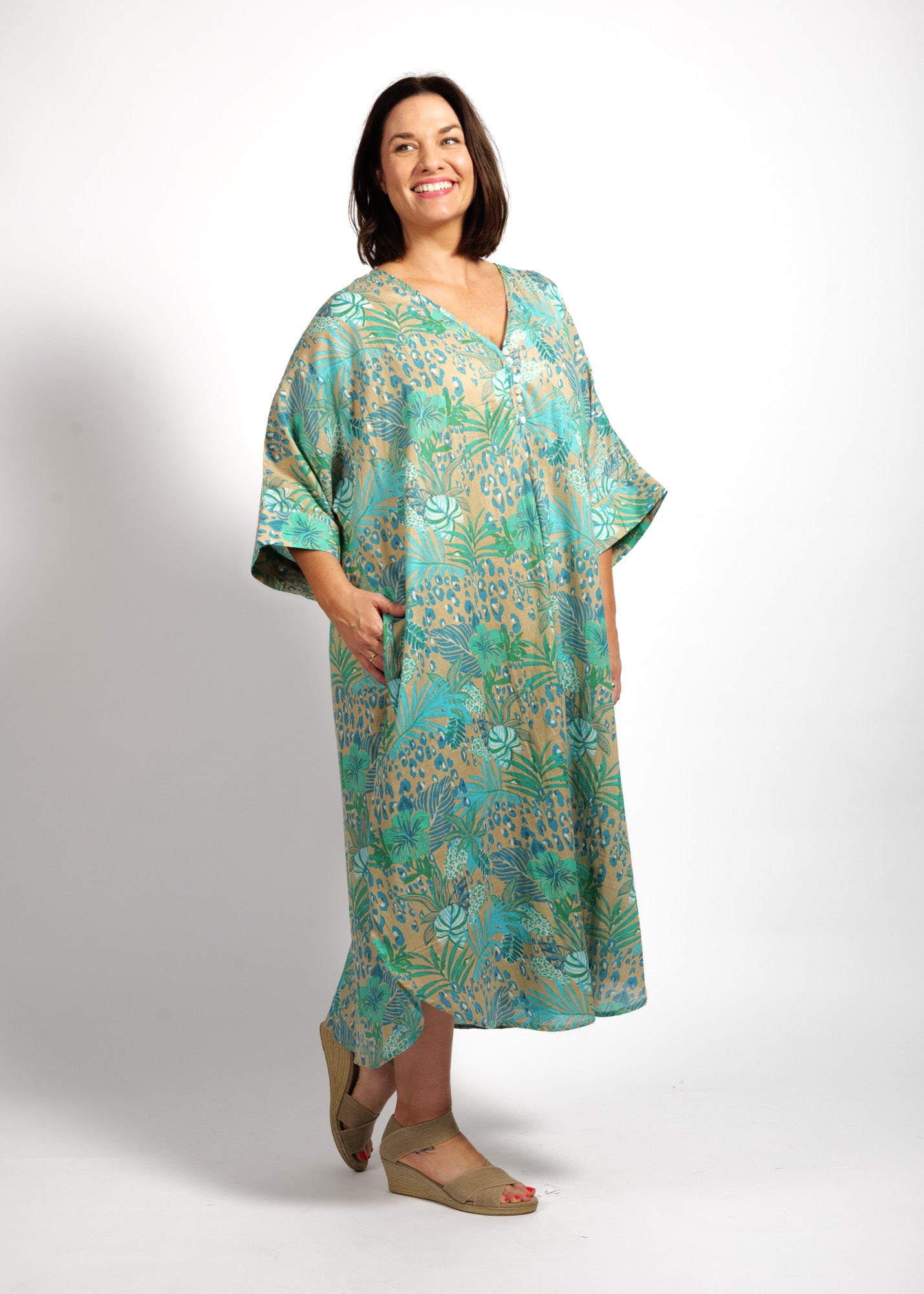 The Stella dress is designed for stylish, cool comfort. The V-neckline with roulette buttons and curved hemline with generous side slits create a graceful and feminine silhouette. The generous 3/4 sleeves with reversible cuffs add a touch of versatility. The maxi length offers a dramatic and elegant look. Crafted from pure cotton, it’s an easy to wear piece that will make you feel effortlessly chic.